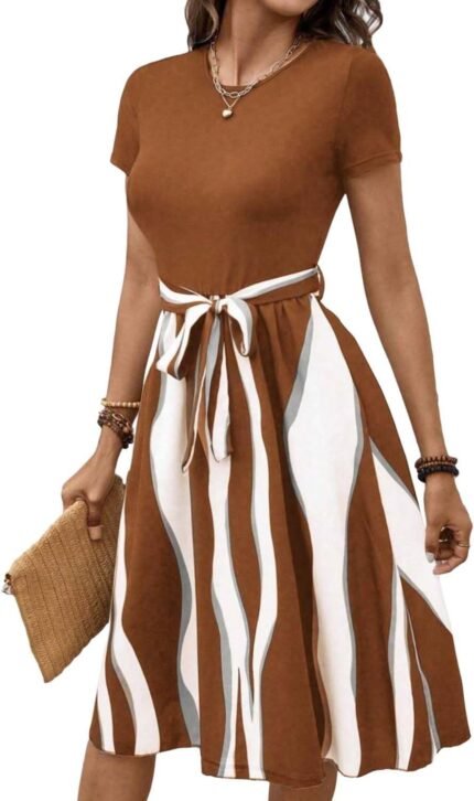 Women’s Summer Dress Tie Waist Modest A Line Belted Midi Short Sleeve Casual Outfit