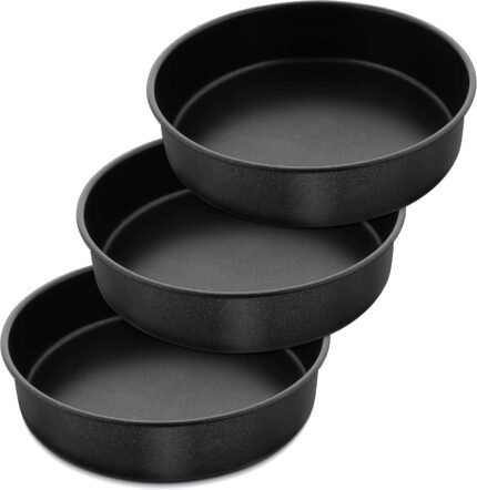 Herogo 8 Inch Black Round Cake Pan Set of 3, Nonstick Sturdy Stainless Steel Baking Pan for Birthday Wedding Christmas, Steaming Serving, Healthy & Toxic Free, Oven Safe & Easy Cleaning