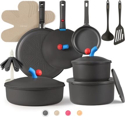 CAROTE 25pcs Ceramic Cookware Set, Pots and Pans Set Non Stick, Induction Kitchen Cookware Sets, Non Stick RV Cookware Set with Detachable Handle, Dishwasher/Oven Safe Cookware Set, Dark Gray