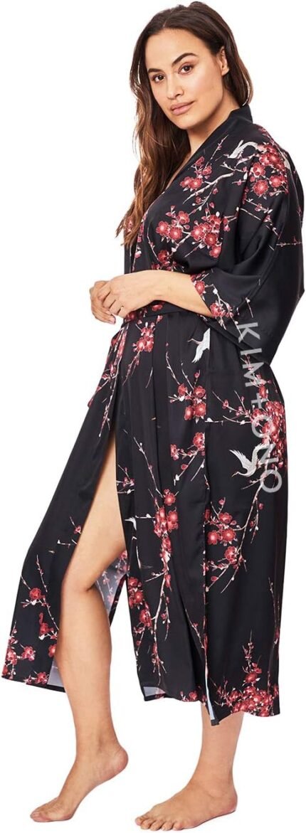 KIM+ONO Women’s Plus Size Charmeuse Kimono Robe Long – Watercolor Floral