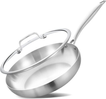 Inqibee 10 Inch Tri-Ply Stainless Steel Frying Pan with Lid,Skillet,Small Sauté Pan,Induction Chef’s Cooking Pan,Dishwasher and Oven Safe.