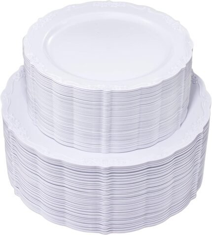 U-QE 100 Pieces White Disposable Plates – Premium Hard Plastic Plates for Wedding and Party Use Including 50 Dinner 10.25 ” & 50 Dessert 7.5 ” Plates