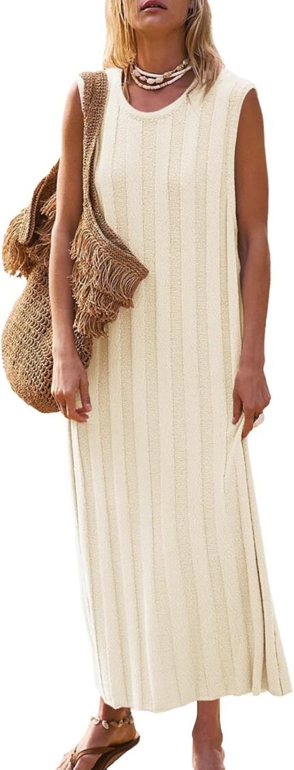 Fisoew Women’s Summer Sleeveless Maxi Dress Scoop Neck Ribbed Knit Tank Top Dresses