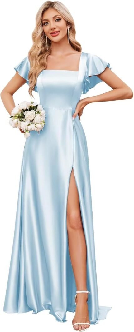 Ruffle Sleeves Satin Bridesmaid Dresses Long A-Line Square Neck Formal Wedding Guest Dress with Slit