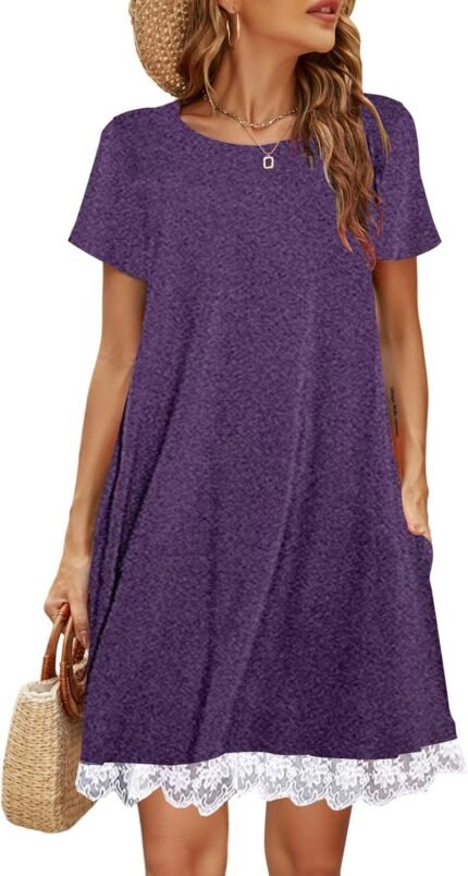 Halife Womens Summer Casual Tshirt Dress Loose Lace Hem Short Sleeve Beach Sundresses with Pockets