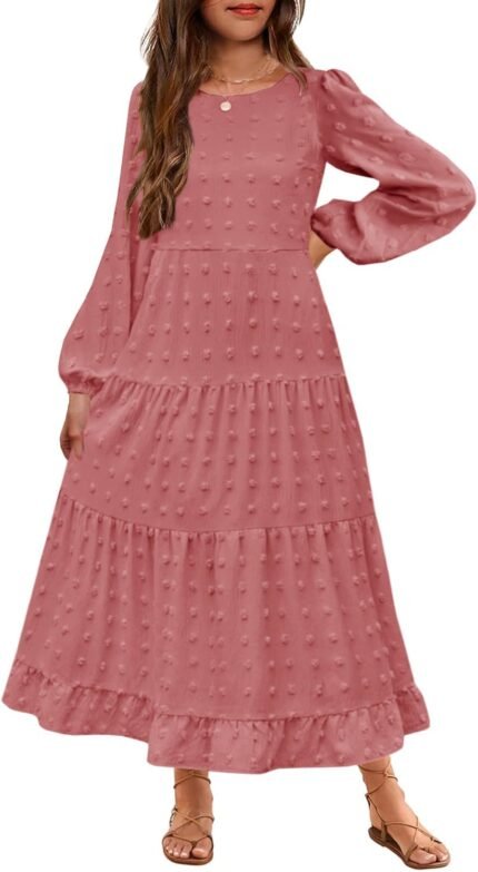 HOSIKA Girls Maxi Dress Long Sleeve Swiss Dot A Line Tiered Flowy Casual Party Dresses with Pockets for 6-12 Y