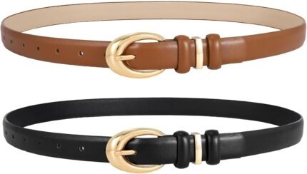 LEACOOLKEY 2 Pack Women Leather Belts for Jeans Dress Fashion Ladies Belt with Gold Silver Buckle