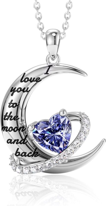 Distance I Love You to The Moon and Back Necklace, S925 Sterling Silver Heart Birthstone Necklace, Birthday Mother’s Day Jewelry Gifts for Women Wife Lovers