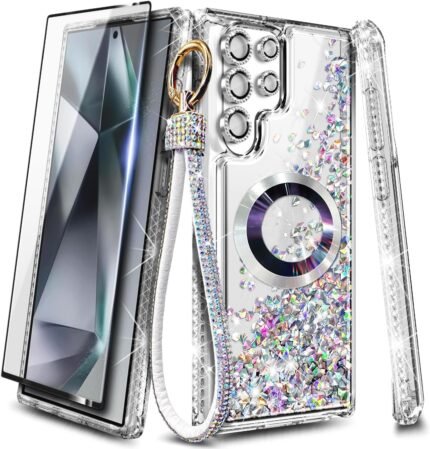 NGB Supremacy Designed for Samsung Galaxy S24 Ultra Magnetic Case for MagSafe, Tempered Glass Screen Protector/Camera Lens Protector/Wrist Strap Lanyard, Glitter Liquid Cute Case (Diamond)