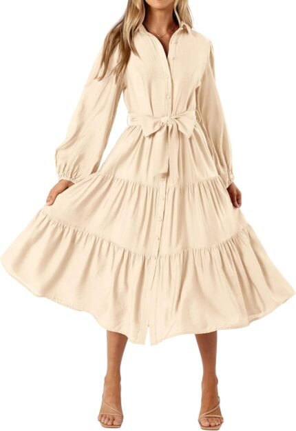 MASCOMODA Womens Dresses 2025 Fall Long Sleeve Midi Dress Casual V Neck Button Down Tiered Flowy Aline Tie Waist Shirt Dress