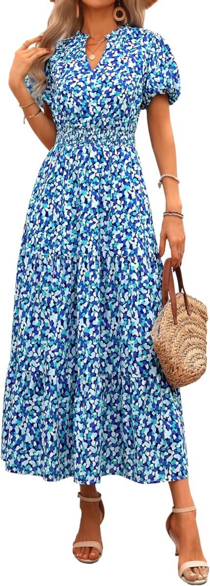 MASCOMODA Summer Maxi Dresses for Women 2025 Casual V Neck Puff Short Sleeve Smocked Flowy Beach Boho Long Floral Dress