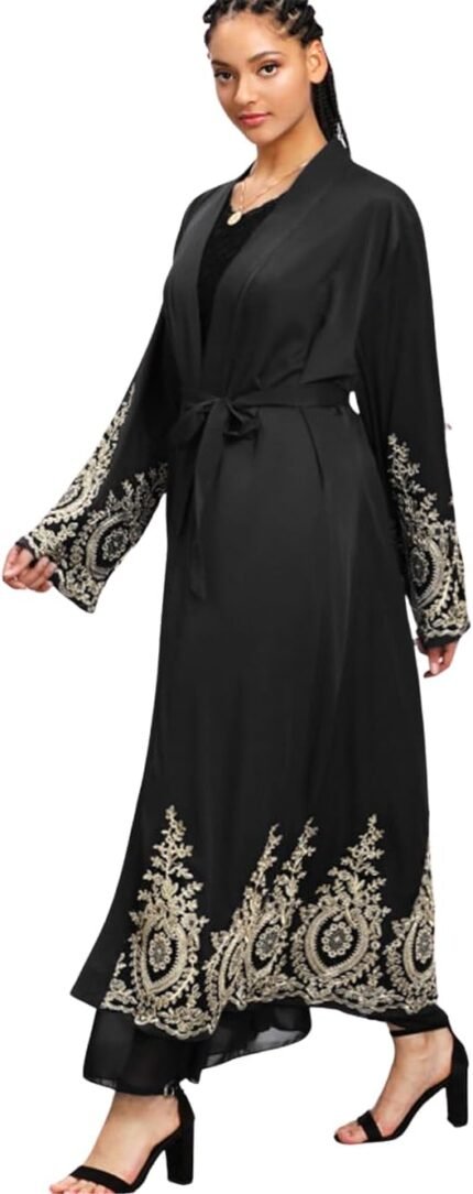 HUSN Serenity Black Robe Open-Front Abaya – Duster Cardigan with Golden Embroidered Sleeves – Womens Duster for Modest Women