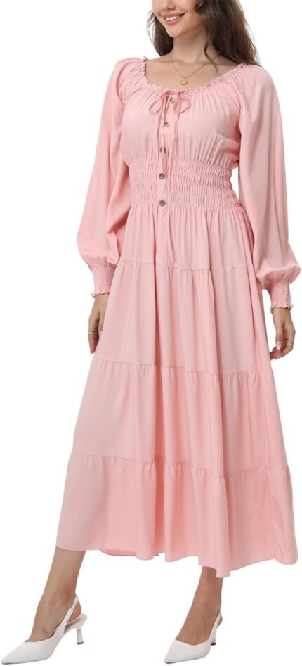 OSTOO Women’s 2025 Casual Long Sleeve Square Neck Smocked High Waist Flowy Maxi Dress,Boho Tiered Beach Party Dress