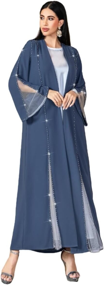 Elegant Beaded Abaya Robe, Open Front Long Sleeve Maxi Outerwear, Modest Cover-Up with Crystal Trim, NO INNER, Blue
