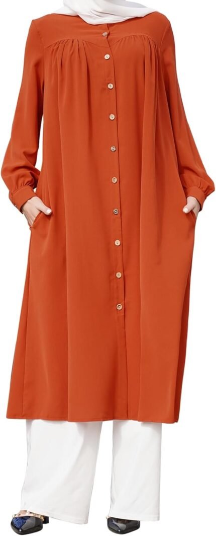 Women’s Muslim Shirt Dresses Solid Full Button Down Ruched Vintage Dress Plus Size Maxi Flowy Dress with Pockets