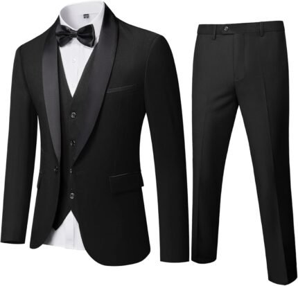 YND Men’s 3 Piece Slim Fit Tuxedo Set, One Button Shawl Collar Solid Jacket Vest Pants with Bow Tie