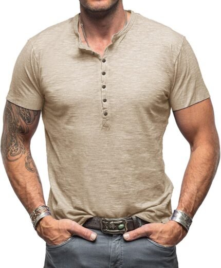 Mens Henley Shirts Casual Short Sleeve Basic Tee Summer Button Polo Soild T Shirts