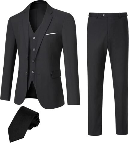 Men’s Suit Slim Fit 3 Pieces Suit Set, Business Casual Suits for Men Two Button Soild Jacket Vest Pants Set with Tie