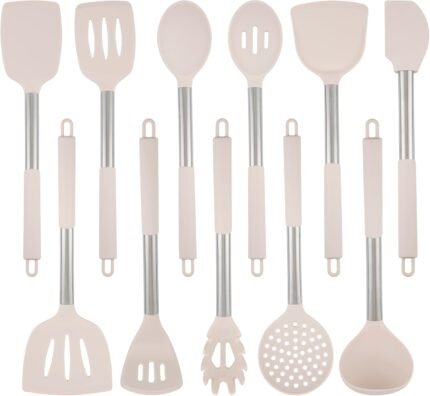 Large Silicone Kitchen Cooking Utensils Set, 11 pcs Cooking Utensils, Kitchen Tools Gadgets for Nonstick Cookware, Spatula, Turner, Masher, Ladle, Strainer, Server, BPA FREE, Dishwasher Safe (Khaki)