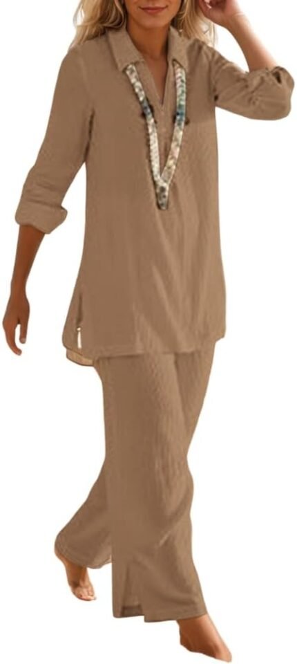 Womens Lounge Cotton Linen Two Piece Outfits Spring Summer Oversized Long Sleeve Tops and Wide Leg Pants Suits Sets
