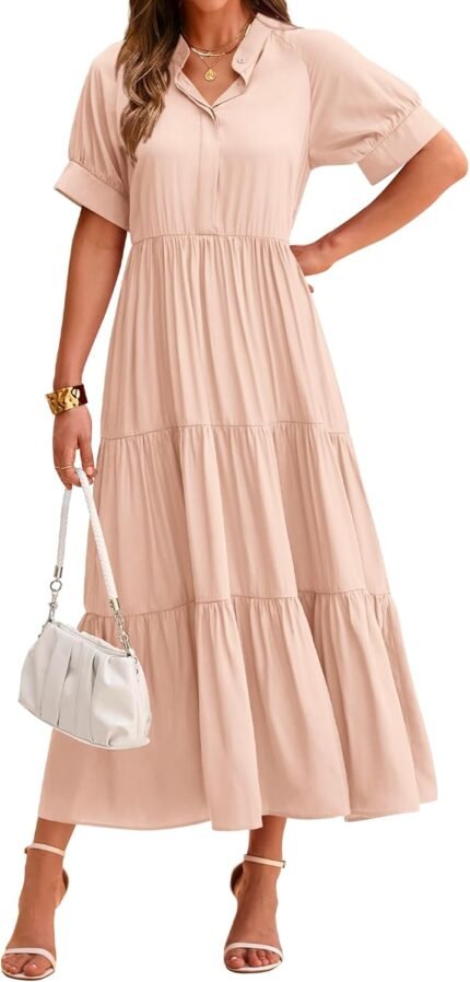 dowerme Women’s Summer Dresses 2025 Casual Short Sleeve Button Loose Fit Pleated Boho Flowy Swing Long Beach Sun Dress