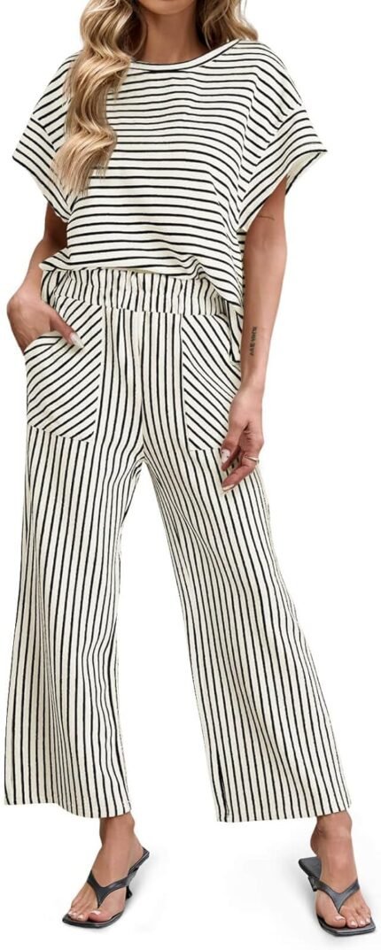 Tankaneo Womens Striped 2 Piece Sets Short Sleeve T Shirts Wide Leg Pants Matching Lounge Set with Pockets