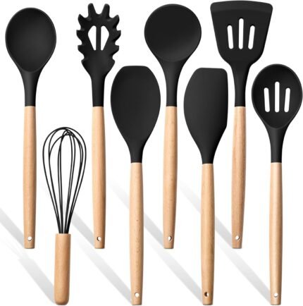 Herogo 8 Pcs Kitchen Cooking Utensils Set, Heat Resistant Non-Stick Silicone Cooking Kitchen Utensils Set with Wooden Handle, Food-Grade Silicone Spatula Spoon Turner Server Whisk Ladle (Black)