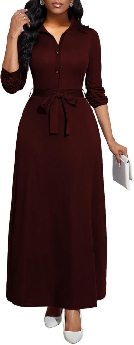 LaiyiVic Maxi Dress for Women Casual Long Sleeve Button Down Floor Length V-Neck Long Dress with Belt