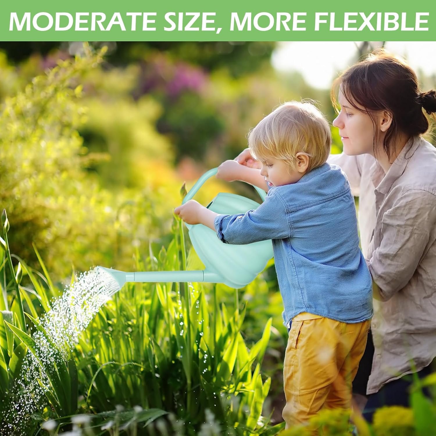watering container has a long stem spout design that aids in controlling and permits focused watering