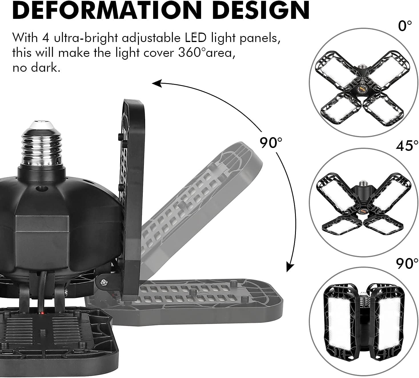 Adjustable Design: Unique wide-angle LED garage lighting design with 4 adjustable panels. Each panel can be folded over 90 degrees, which will make the light cover 360° area, no dark areas, ghosting, or glare. It is the best choice to replace the old three-leaf garage light!