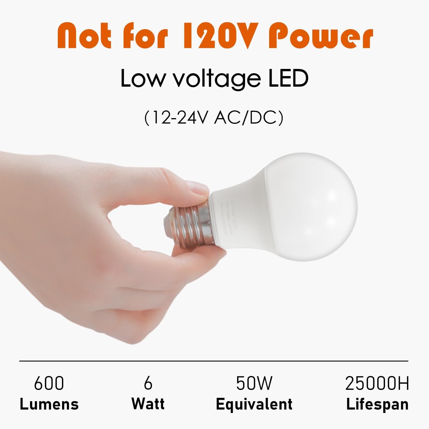 12V LED Bulb 6W(50W Equivalent), Warm White 3000K, 12V-24V AC/DC, 600 Lumens, Non-Dimmable, A19 12V DC LED Light Bulbs, E26 Base, Pack of 6