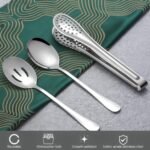 14 PIECE SERVING UTENSIL SET: The package includes 3 larger serving spoons, 3 slotted serving spoons, 2 serving forks, 2 serving tongs, 2 appetizer tongs, and 1 soup ladle and 1 pie server. Stainless steel flatware serving set suitable for fmaily party,banquet and satisfy your daily demands in serving, cooking, baking, filtering.