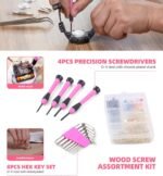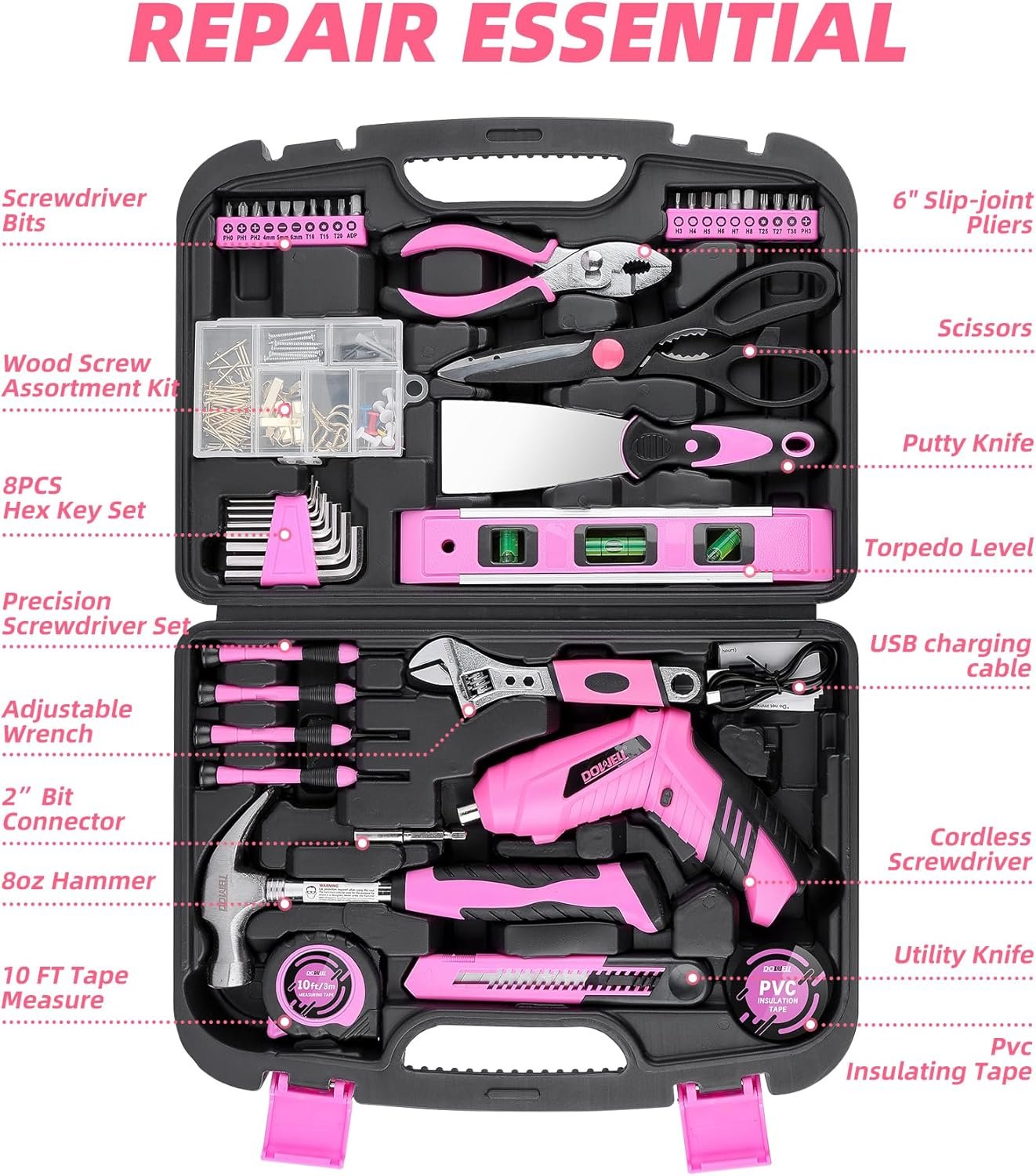 143-PCS PINK TOOL KIT: A cordless electric screwdriver with variety of basic tools, hammer, adjustable wrenches, pliers, scissors, utility knife, measuring tape, scrapper, mini level, precision screwdrivers, hex keys, bits set and so on. Limited tools with unlimited functionality.