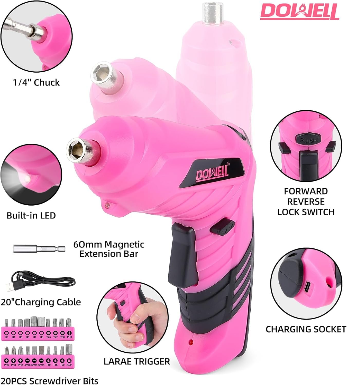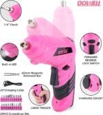 LIGHTWEIGHT PINK ELECTRIC SCREWDRIVER: Cordless, 3.6V motor, equipped with built-in 1300mAH rechargeable lithium-ion battery, a bright LED to light up work areas. Rotatable design can change handle position, more convenient for working in narrow space.