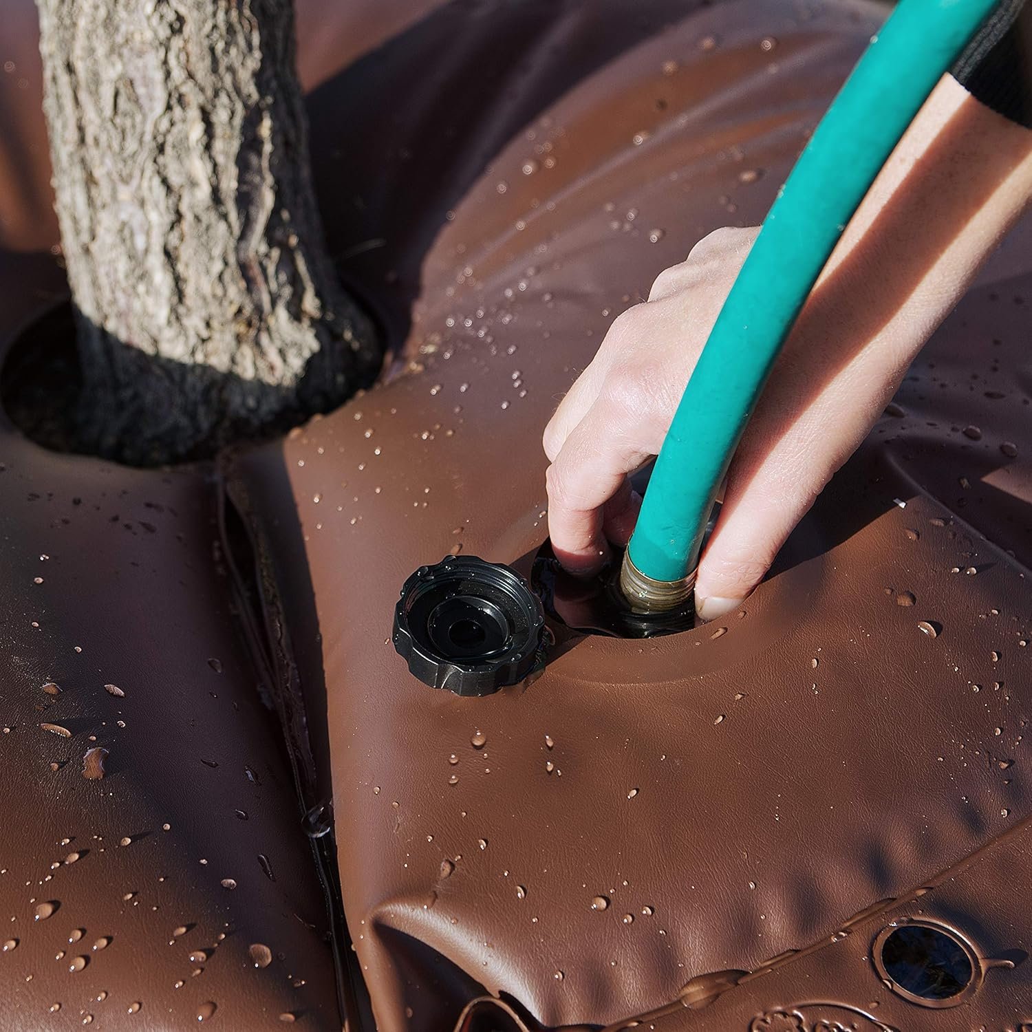 The tree watering ring is aimed at conserving water and saving it from being used excessively. The ring itself can hold up to 15 gallons of water. The plastic cap on the lid has water back-up prevention techniques which doesn’t allow water to spill after you remove the hose.