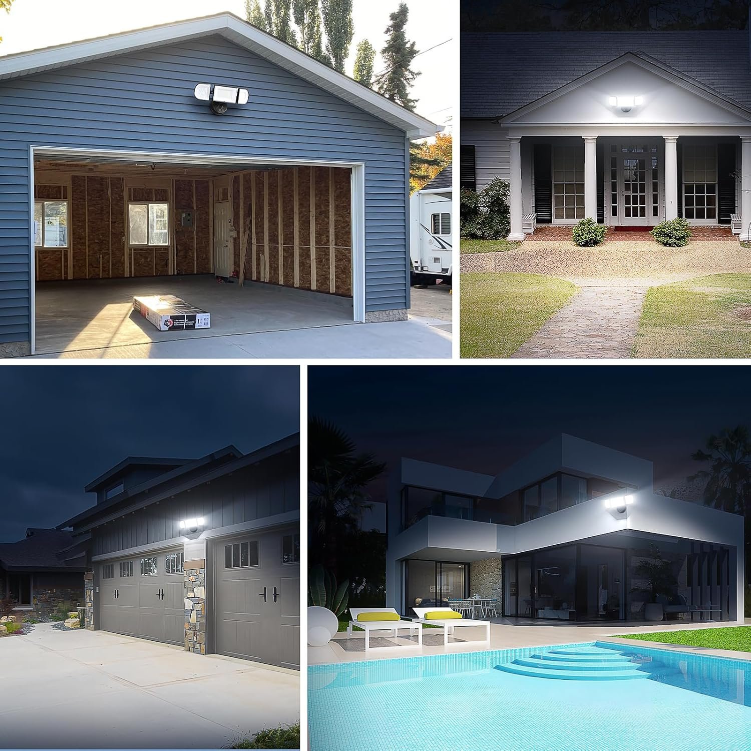 IP65 Waterproof: This exterior security floodlight has IP65 waterproof rating. Whether it is rain, snow, high temperature or cold weather it can have stable performance, Perfect for yards, garages, patios, parking lots, driveways, workshops and large outdoor areas.