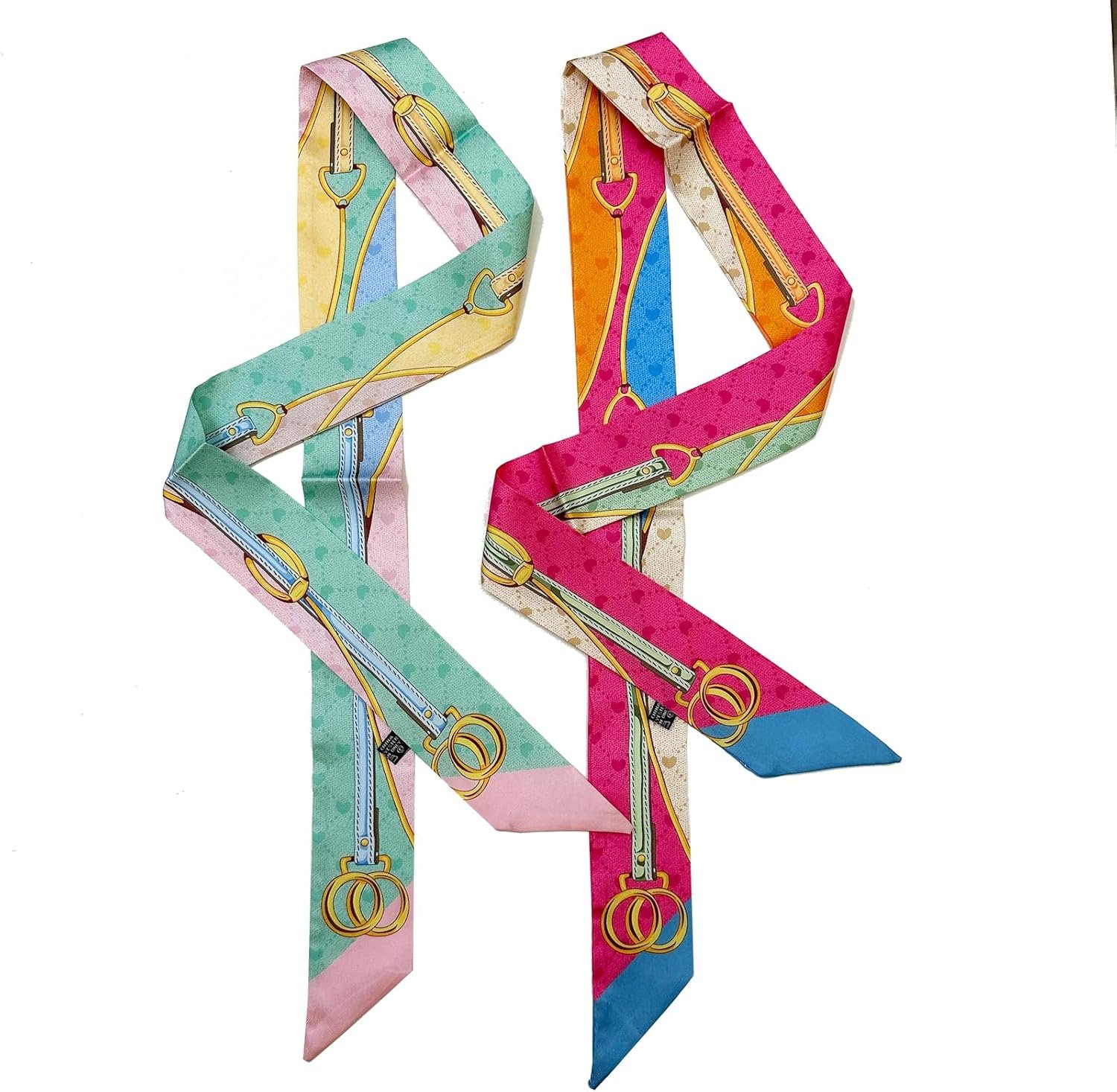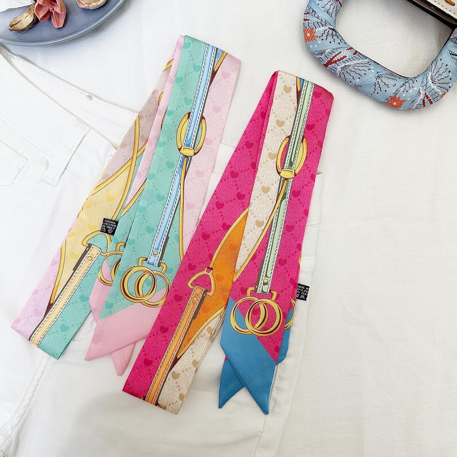 2 Pack Silk Purse Scarf For Handbags Head Hair Ribbon Fashion Skinny Scarf For Women Long Neckerchief