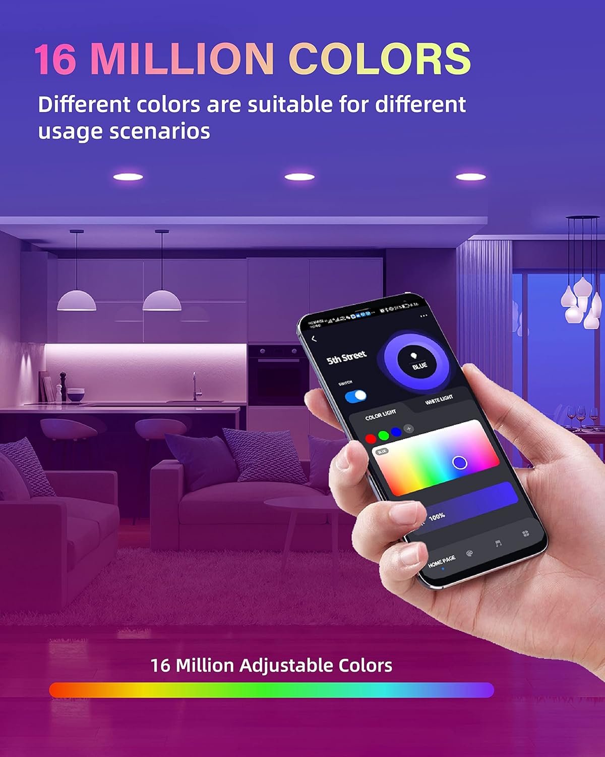 【Variety of Colors & Brightness】 The 4 inch smart recessed downlight supports warm white and cool white from 2700K to 6000K. Provide 16 million colors. 1%-100% brightness is adjustable. 14 scene modes, you can also DIY the scene modes you want.