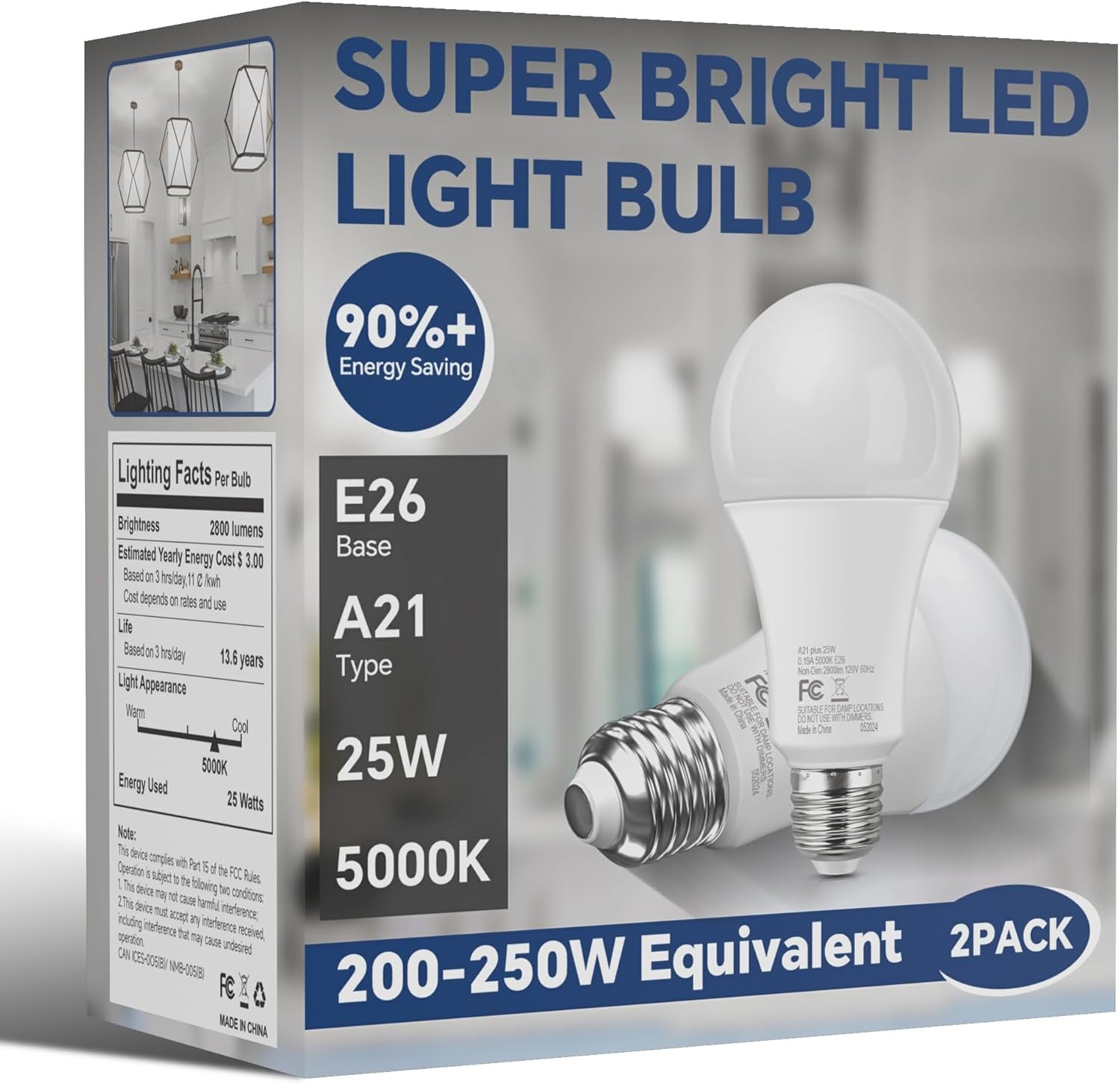 200W Equivalent LED Light Bulb, 2800LM Super Bright A21 LED Bulb, Daylight 5000K, 25W Energy Saving, E26 Medium Base, 120V for Garage, Warehouse, Shop, Living Room, Non-Dimmable, 2 Pack