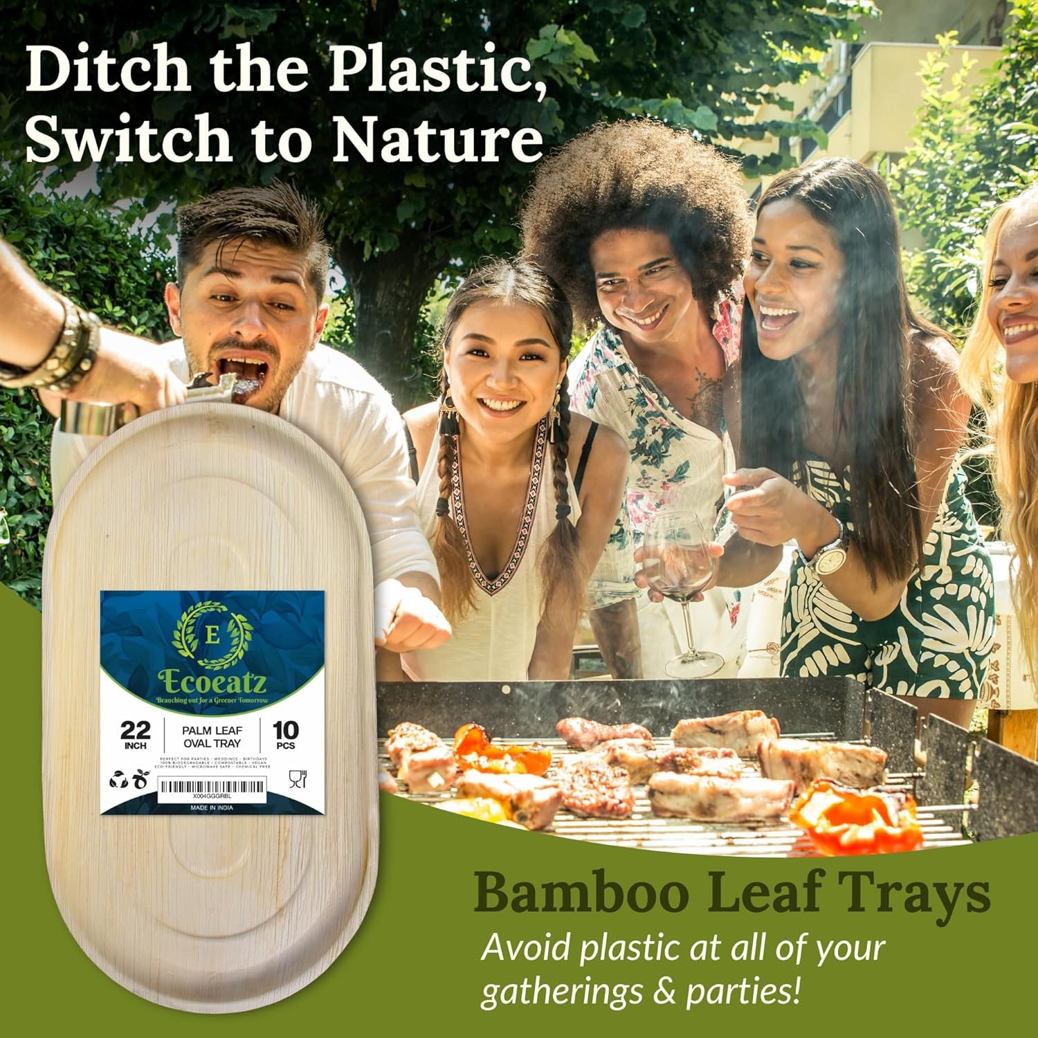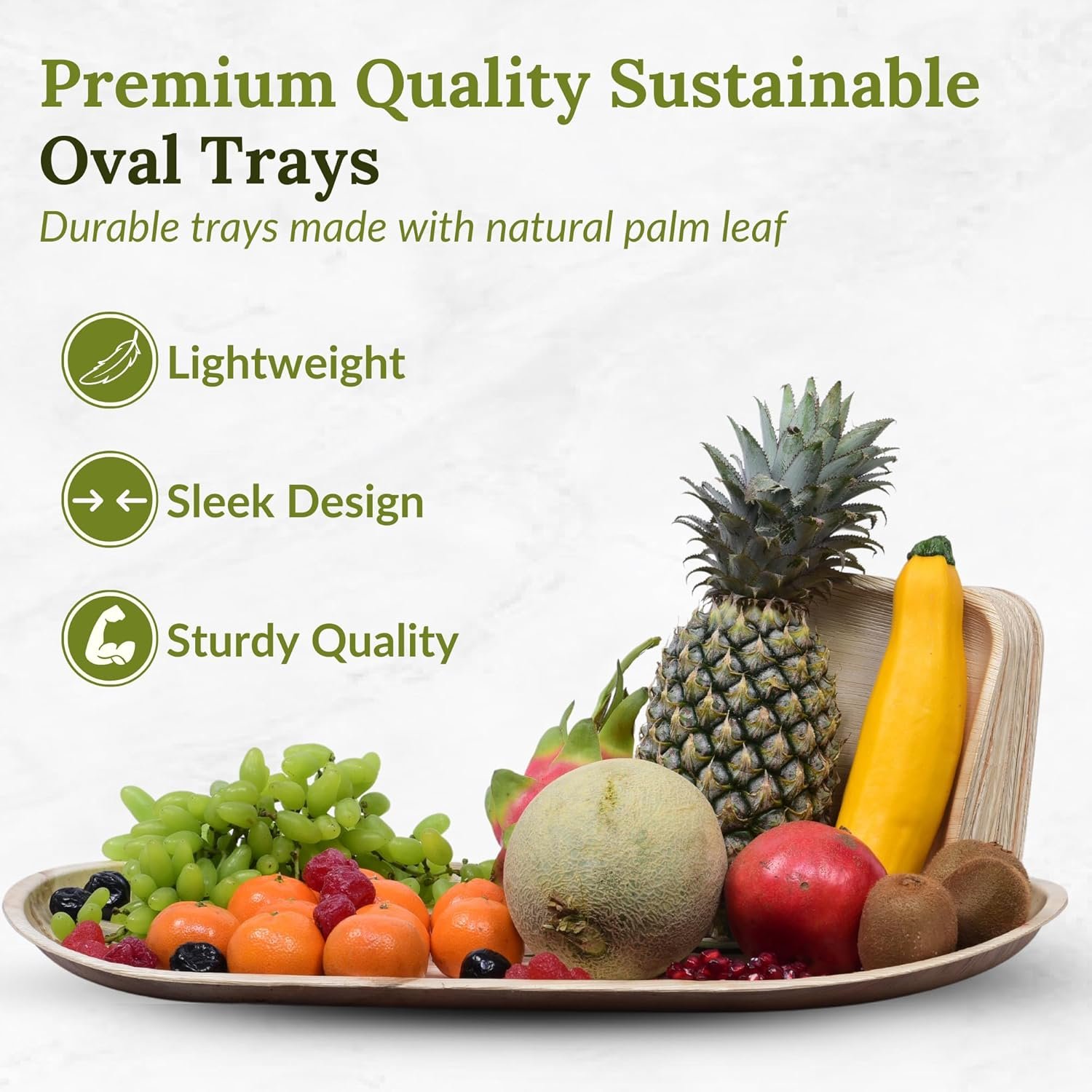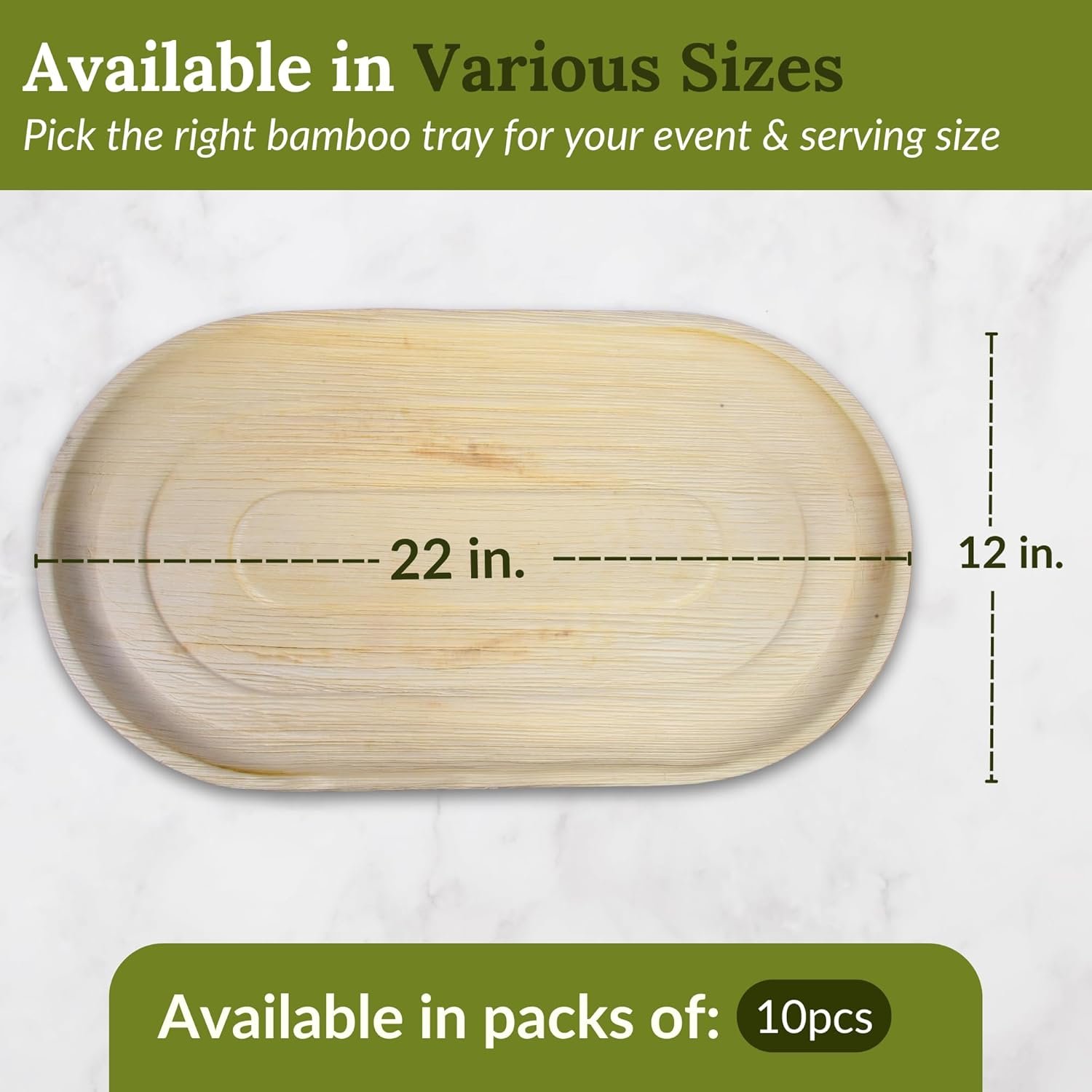 100% Compostable & Sustainable: Made from sustainable palm leaves and bamboo, these extra-large 22″ oval platters offer an eco-friendly alternative to plastic or paper trays for your events.