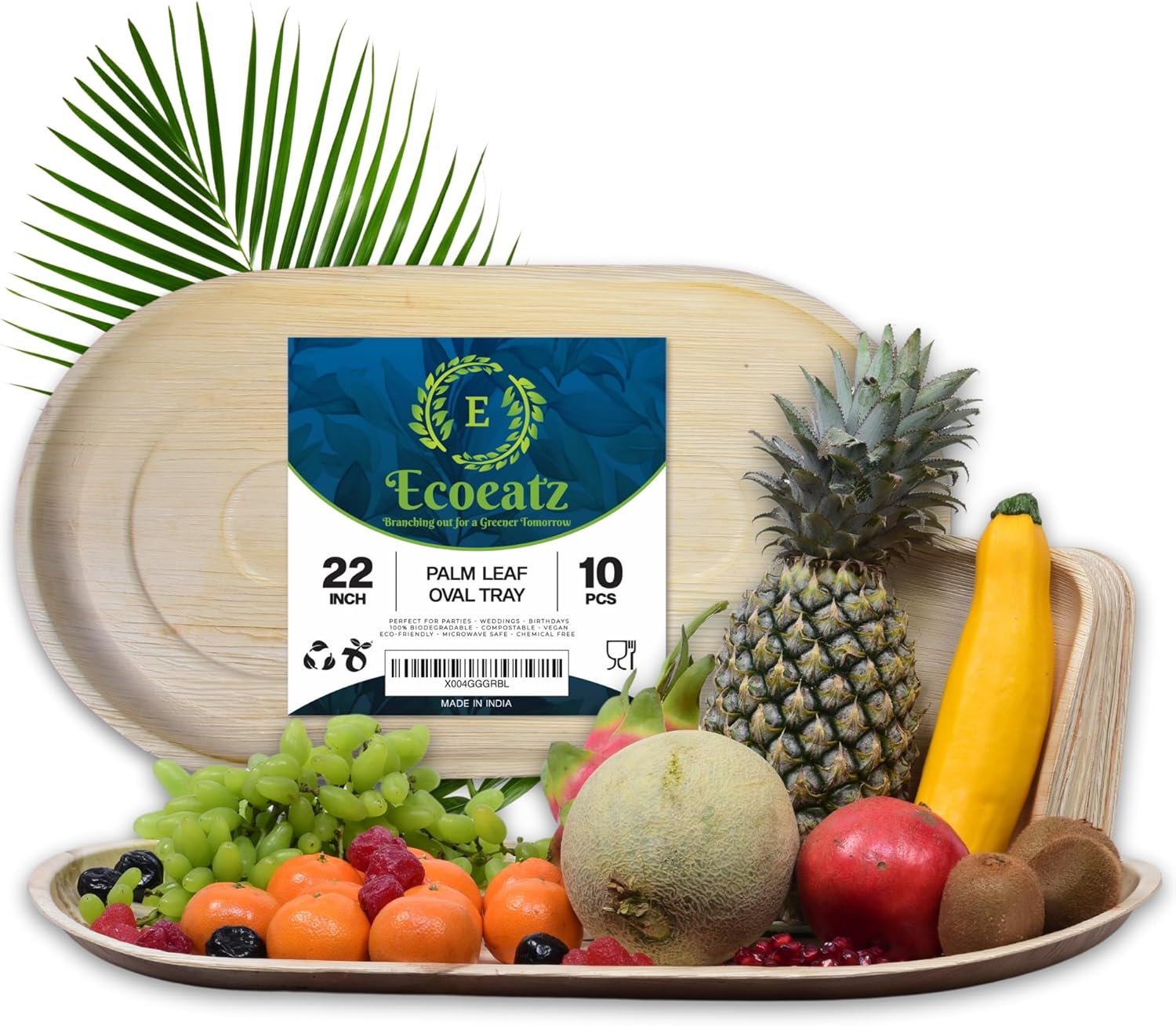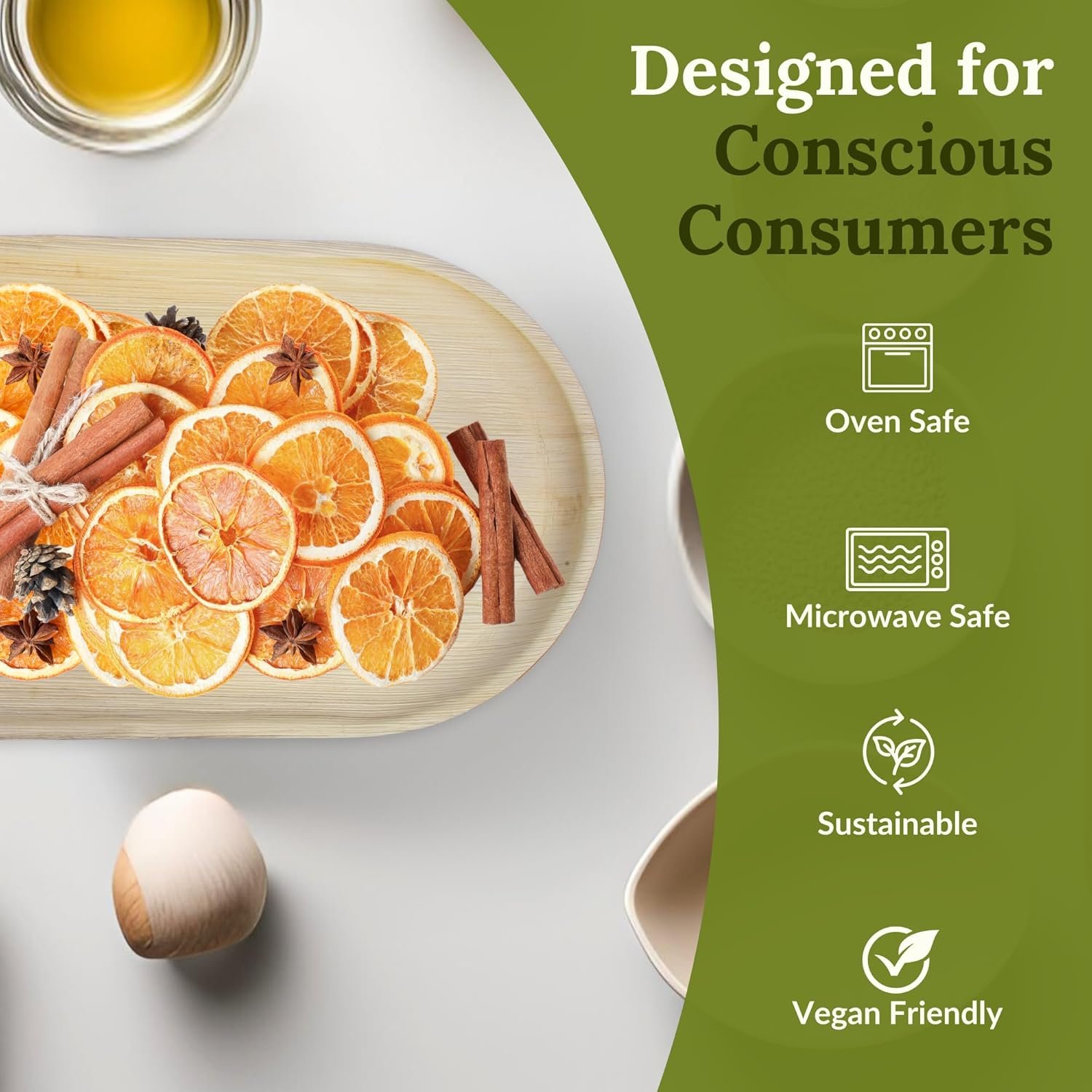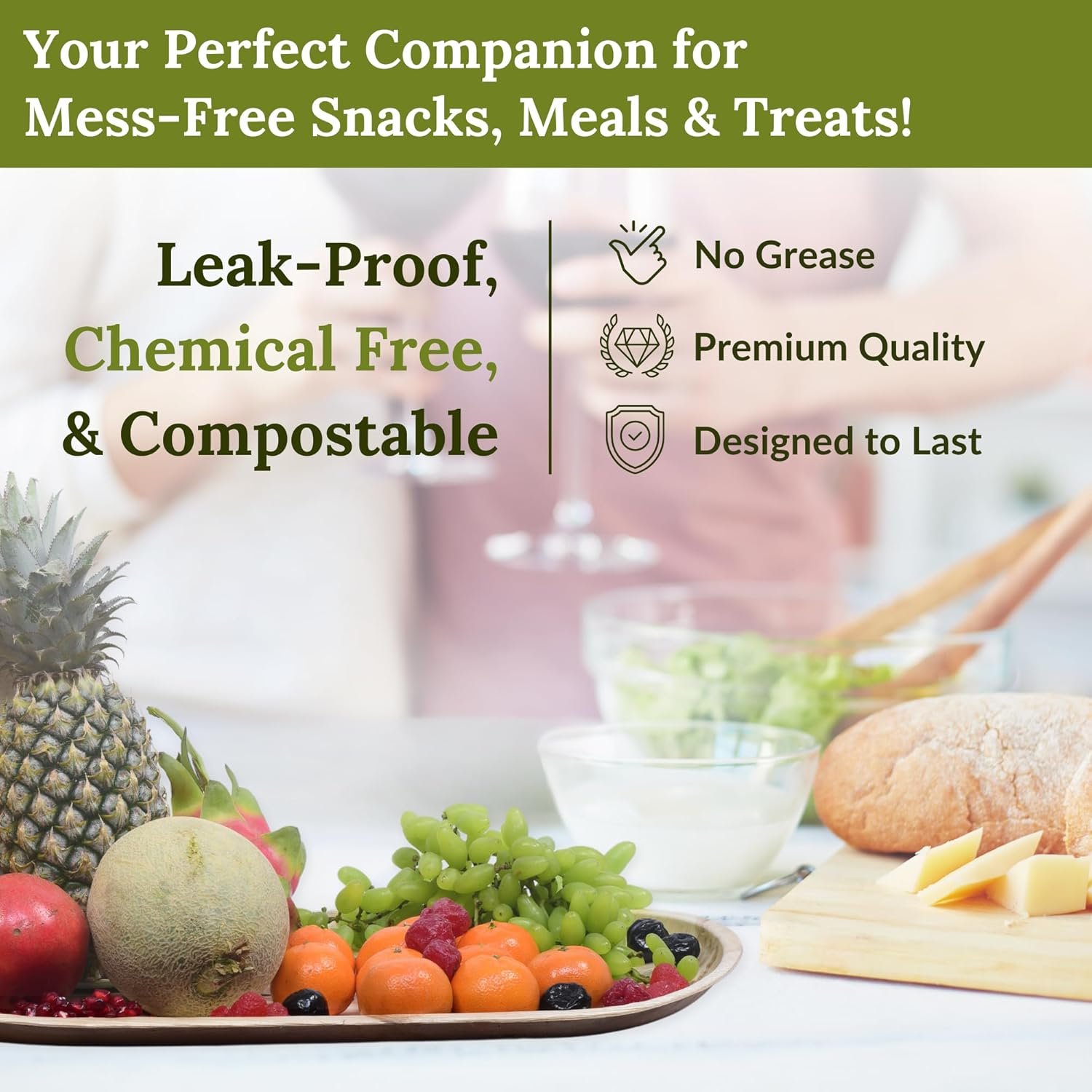 100% Compostable & Sustainable: Made from sustainable palm leaves and bamboo, these extra-large 22″ oval platters offer an eco-friendly alternative to plastic or paper trays for your events.