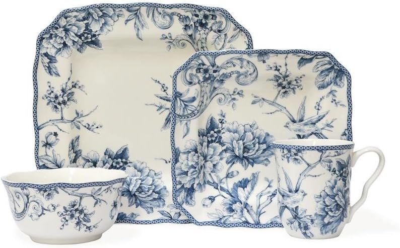 222 Fifth Adelaide 16-Piece Square Floral Dinnerware Set – Service for 4, Blue & White Porcelain Plates & Bowls, for Everyday Dining & Entertainment, Microwave & Dishwasher Safe, Chip Resistant