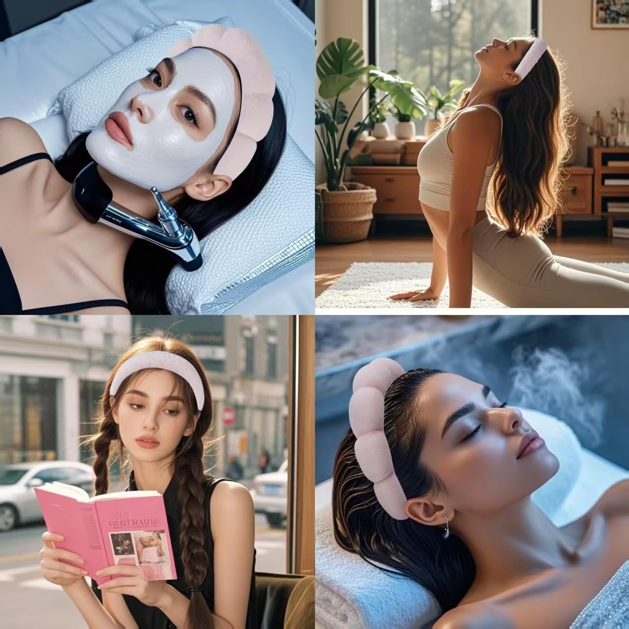 2Pcs Spa Headband for Washing Face & 1 Pairs Wristband Set Sponge Makeup Skincare Headband &Terry Cloth Bubble Soft Hairband for Women Girl Puffy Padded Headwear Non Slip Thick Hair Accessory(Pink)