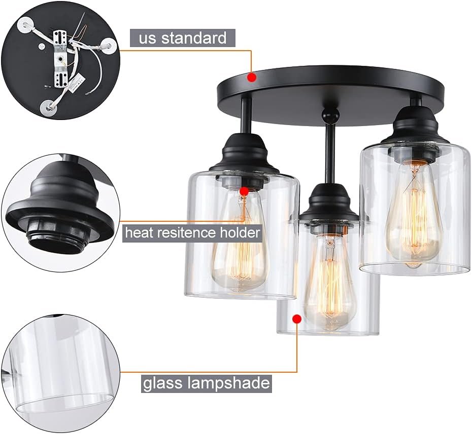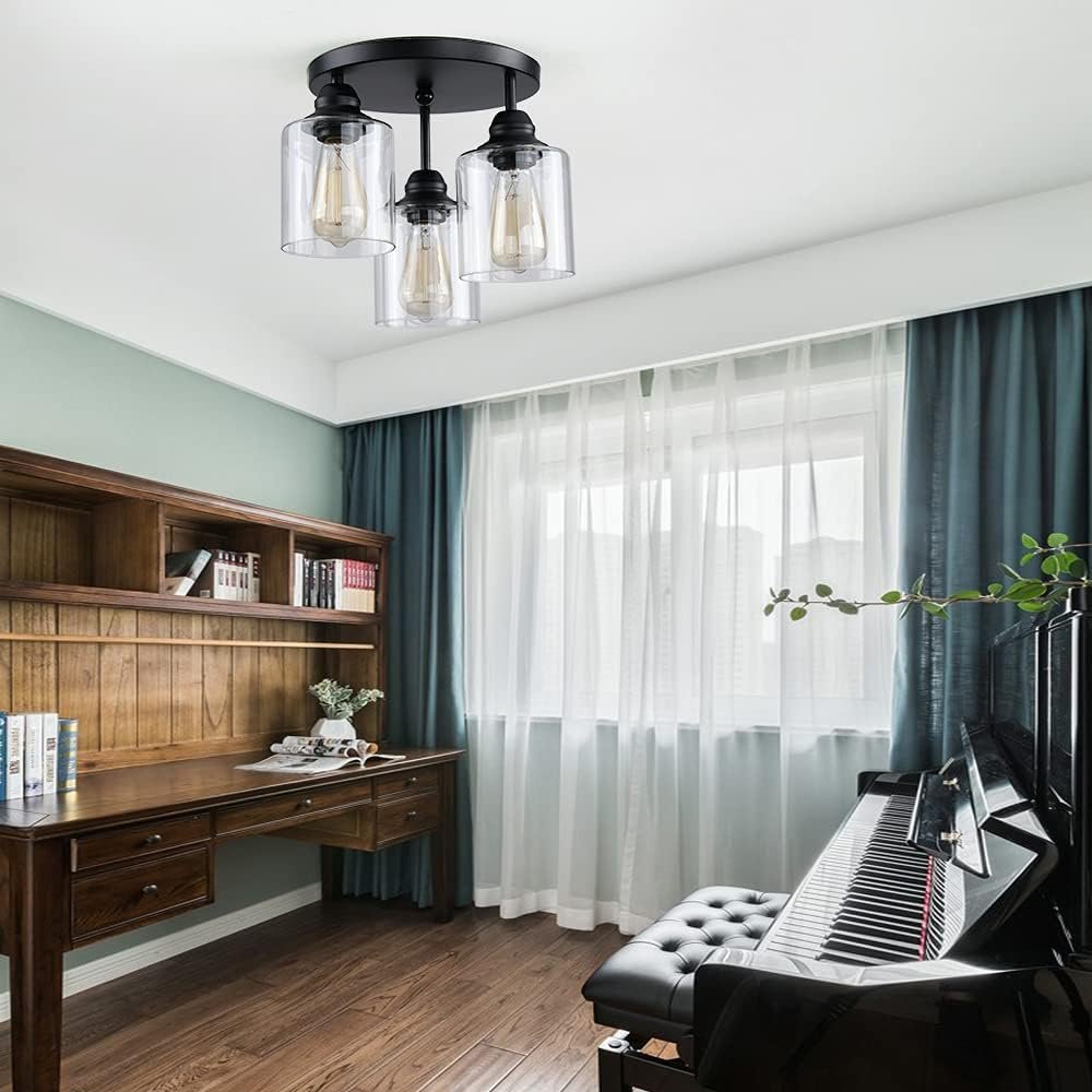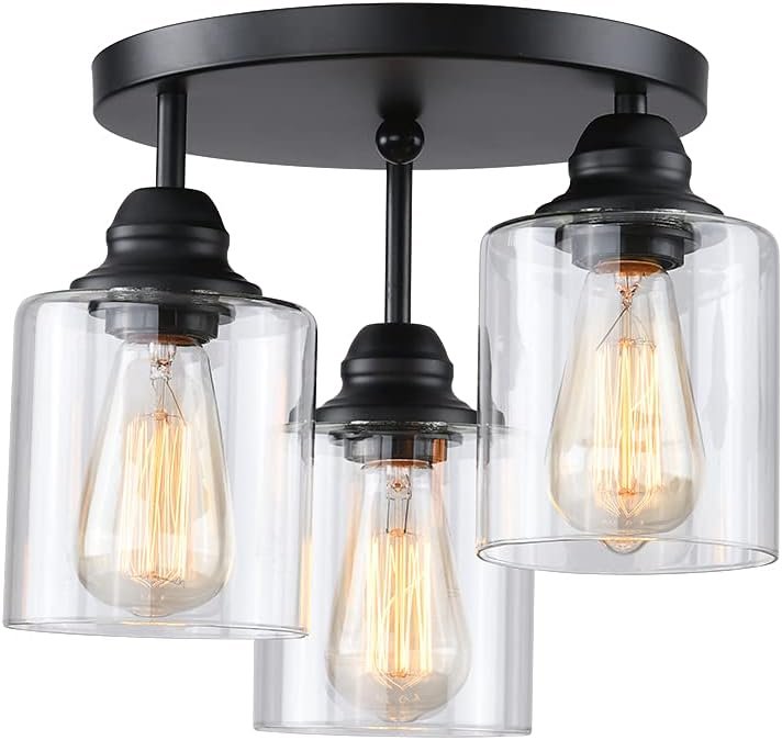 3-Lights Industrial Semi Flush Mount Ceiling Light, Vintage Light Fixture with Clear Seeded Glass Shade