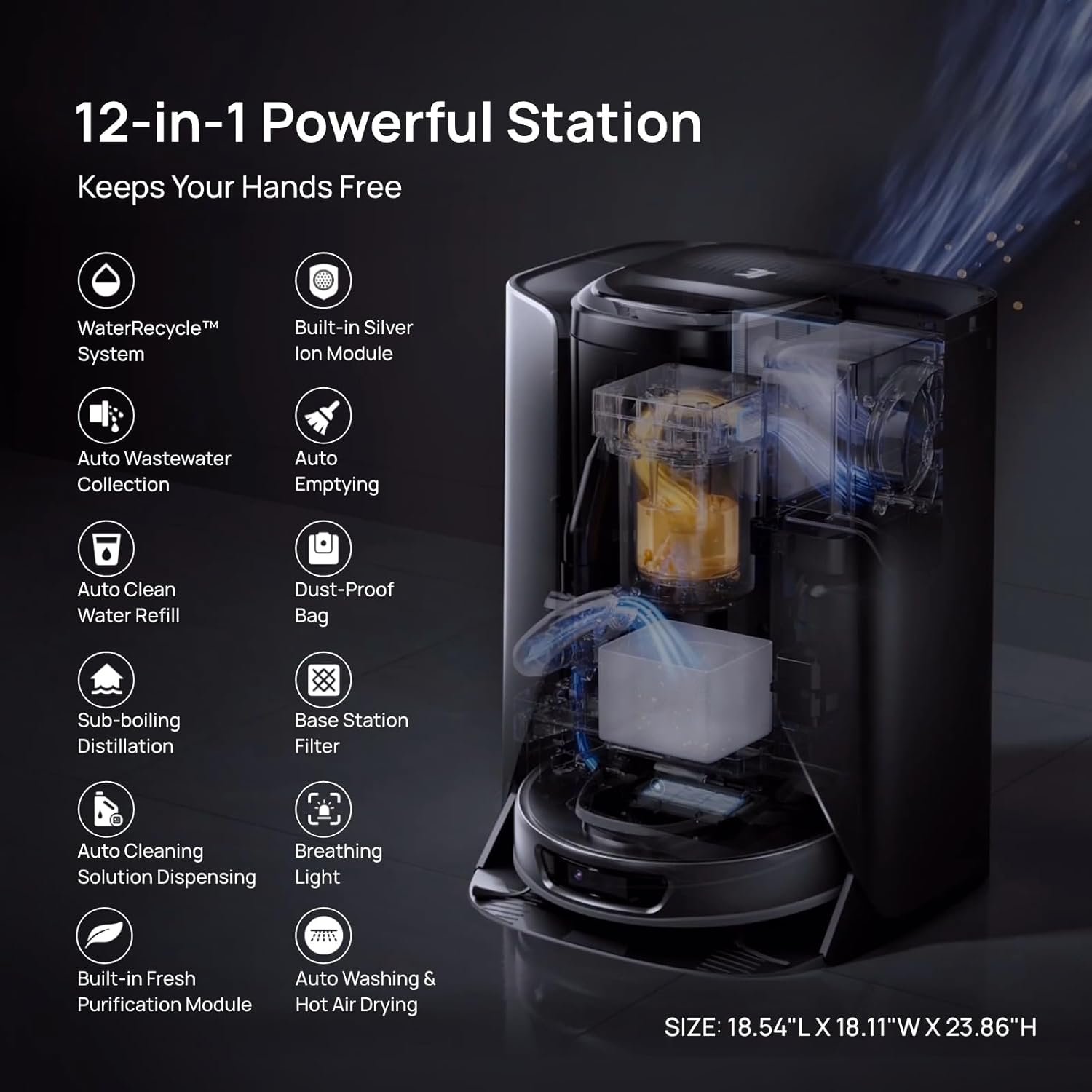 Truly Hands-Free: Automatically adds herbal cleaning solution, 3i S10 Ultra can Self-Cleaning and Self-Drying roller mop, wastewater will be distilled into the garbage and enter the dust bag, and self-refilling with purified water after the water cycle, the 12-in-1 dock station of robot vacuum can Self-Emptying with a 2.5-L capacity ensures 60 days-free