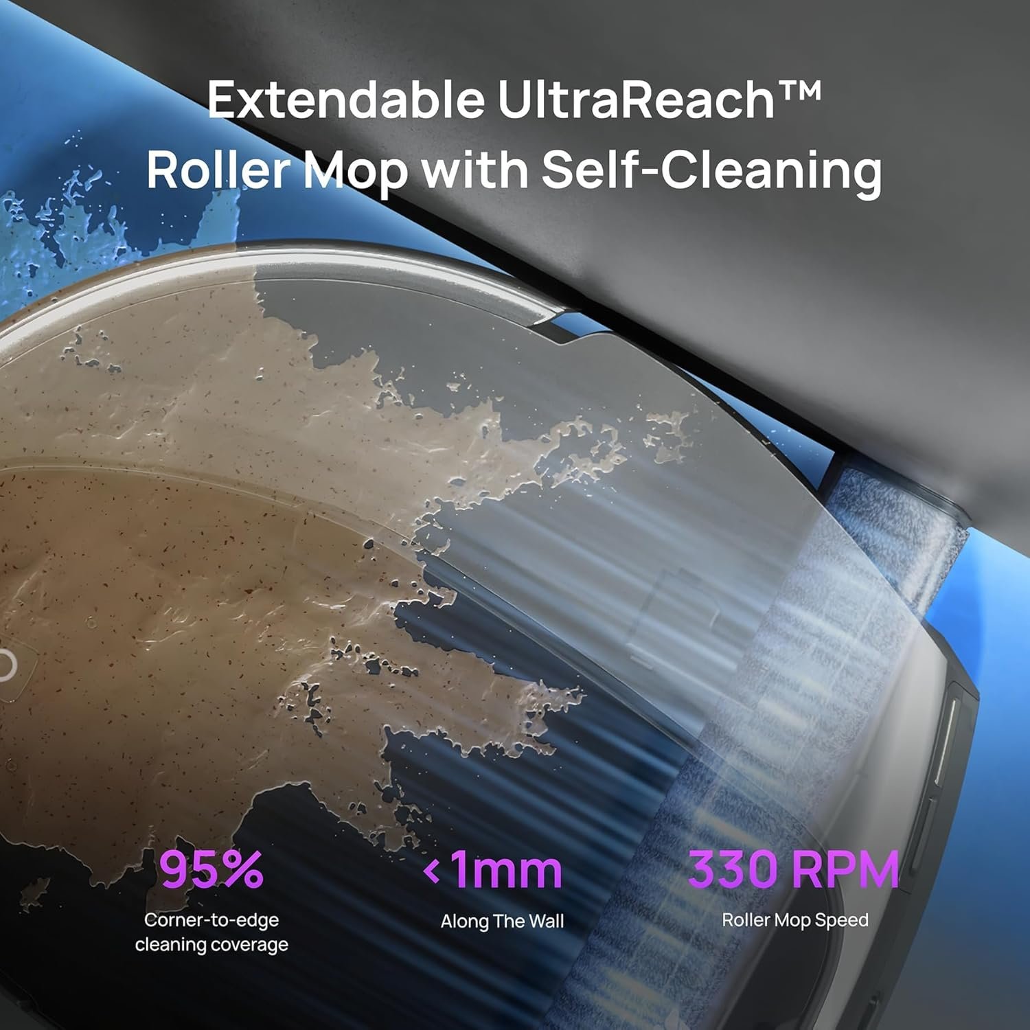 UltraReach Extendable Roller Mop: this self-cleaning robot vacuum mop operates at 330 rpm, boosting cleaning results by 153%. It features 12 spray holes for a steady flow of distilled water and delivers over 7N of consistent mopping pressure. The built-in scraper keeps the roller mop spotless, while the automatic extension allows for precise cleaning along walls down to the millimeter