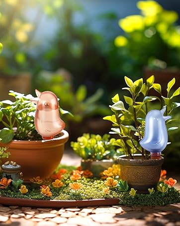 Customers find the watering spikes cute and easy to use for their plants, particularly noting their effectiveness with pomegranate trees and moss poles. The product receives positive feedback for its value and ability to keep potted plants happy. However, customers report mixed experiences with water retention, as water leaks out too fast and drains within 5-10 minutes. Moreover, durability is a concern as customers mention the birds fall apart easily and arrive cracked. Additionally, the size receives mixed reviews, with some finding it perfect for big household plants while others say it’s too small.