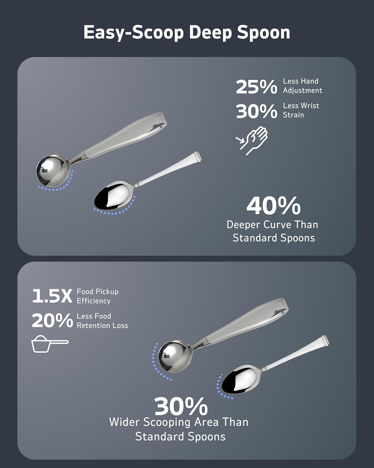 EASY-SCOOP DESIGN FOR SPILL REDUCTION – The deep bowl spoon features a 50% more curved surface, making scooping effortless and reducing spilling. This design is ideal for tremors, Parkinson’s patients, and individuals needing spoons for hand tremors.