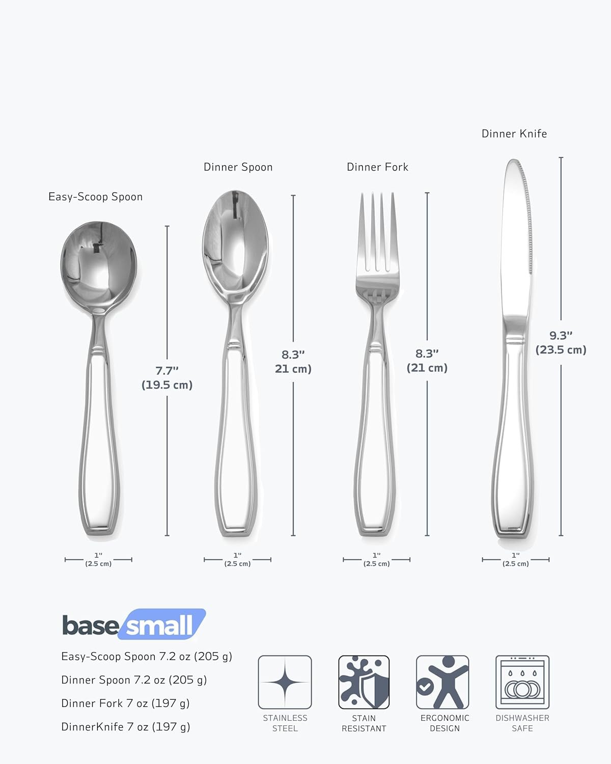 COMPLETE 4-PIECE SET FOR DAILY DINING NEEDS – Includes a weighted knife, fork, tablespoon, and deep bowl soup spoon. This adaptive eating utensil set is perfect for seniors, arthritis sufferers, and Parkinson’s patients, meeting the needs of eating utensils for elderly and disabled people.