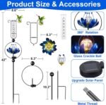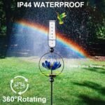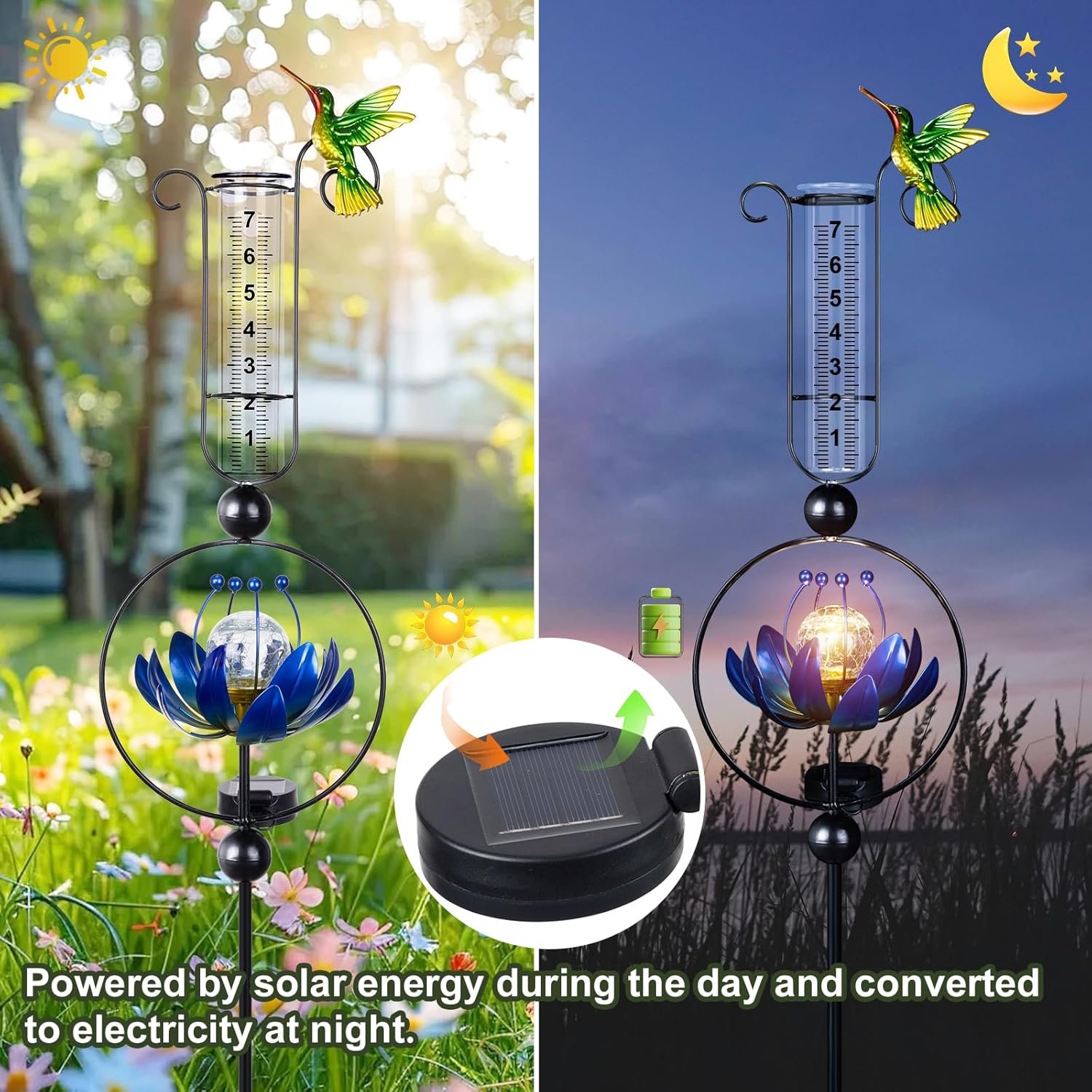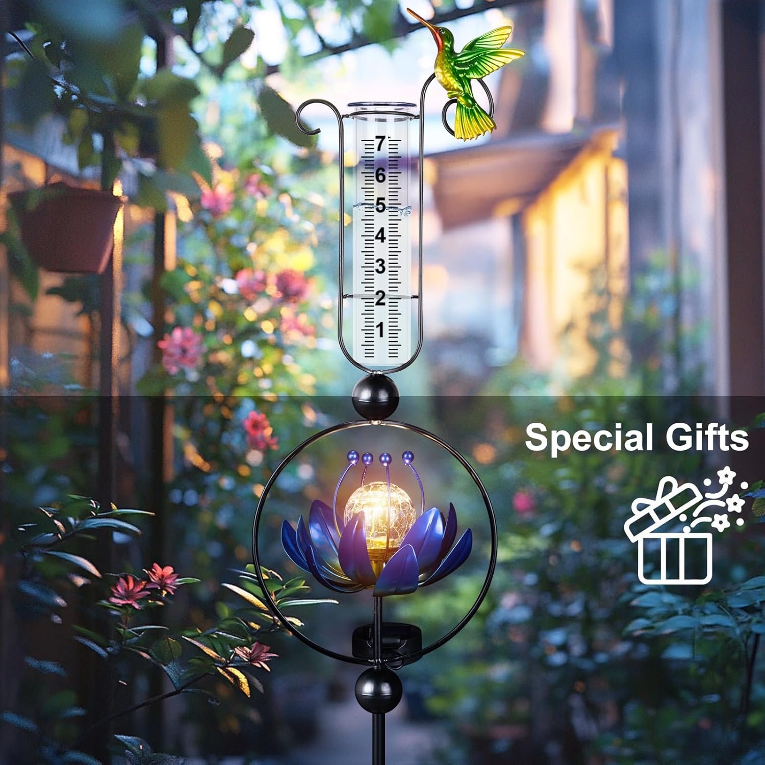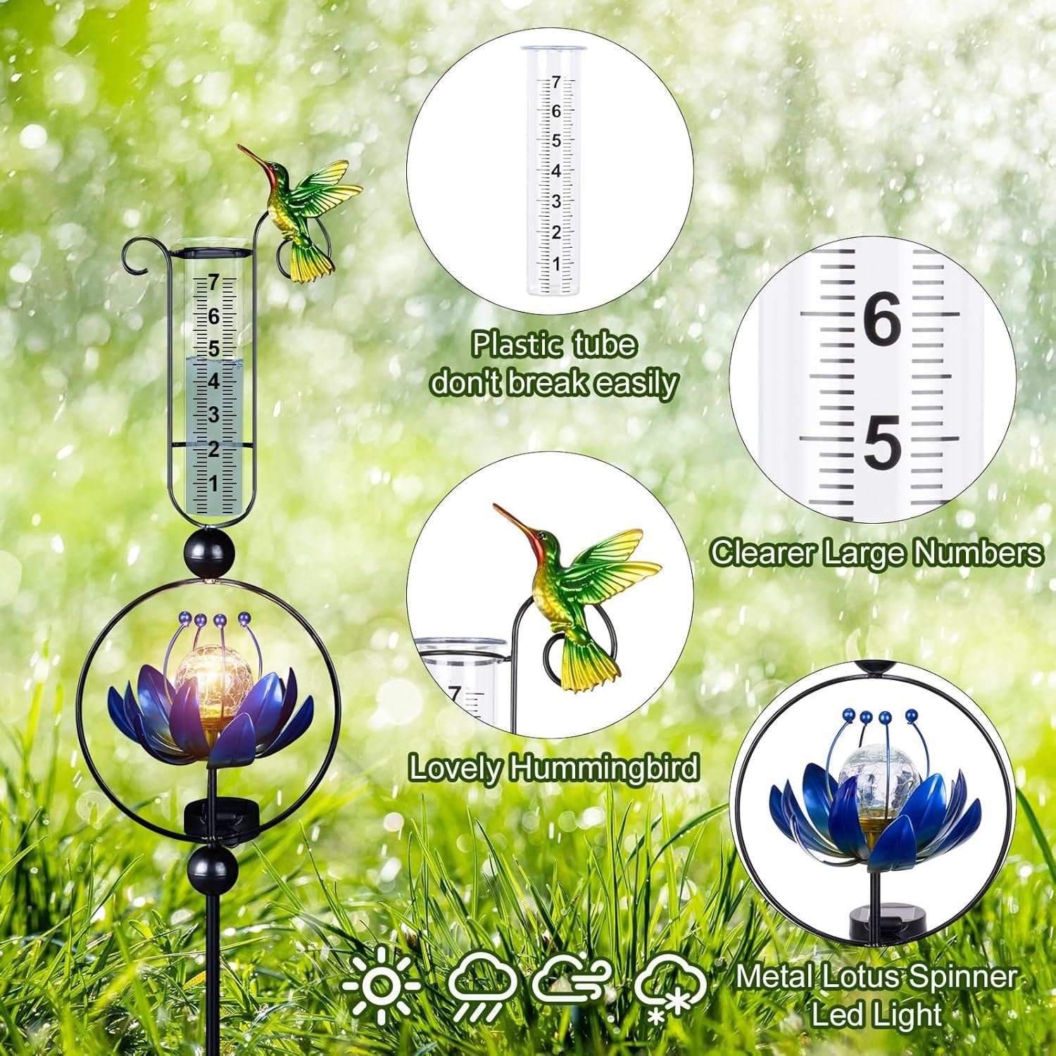 42” Solar Rain Gauge Metal Lotus Flower Wind Spinner Design Outdoor Large Digital Plastic Tube with LED Crystal Ball Light Waterproof Hummingbird Decorative Garden Stake